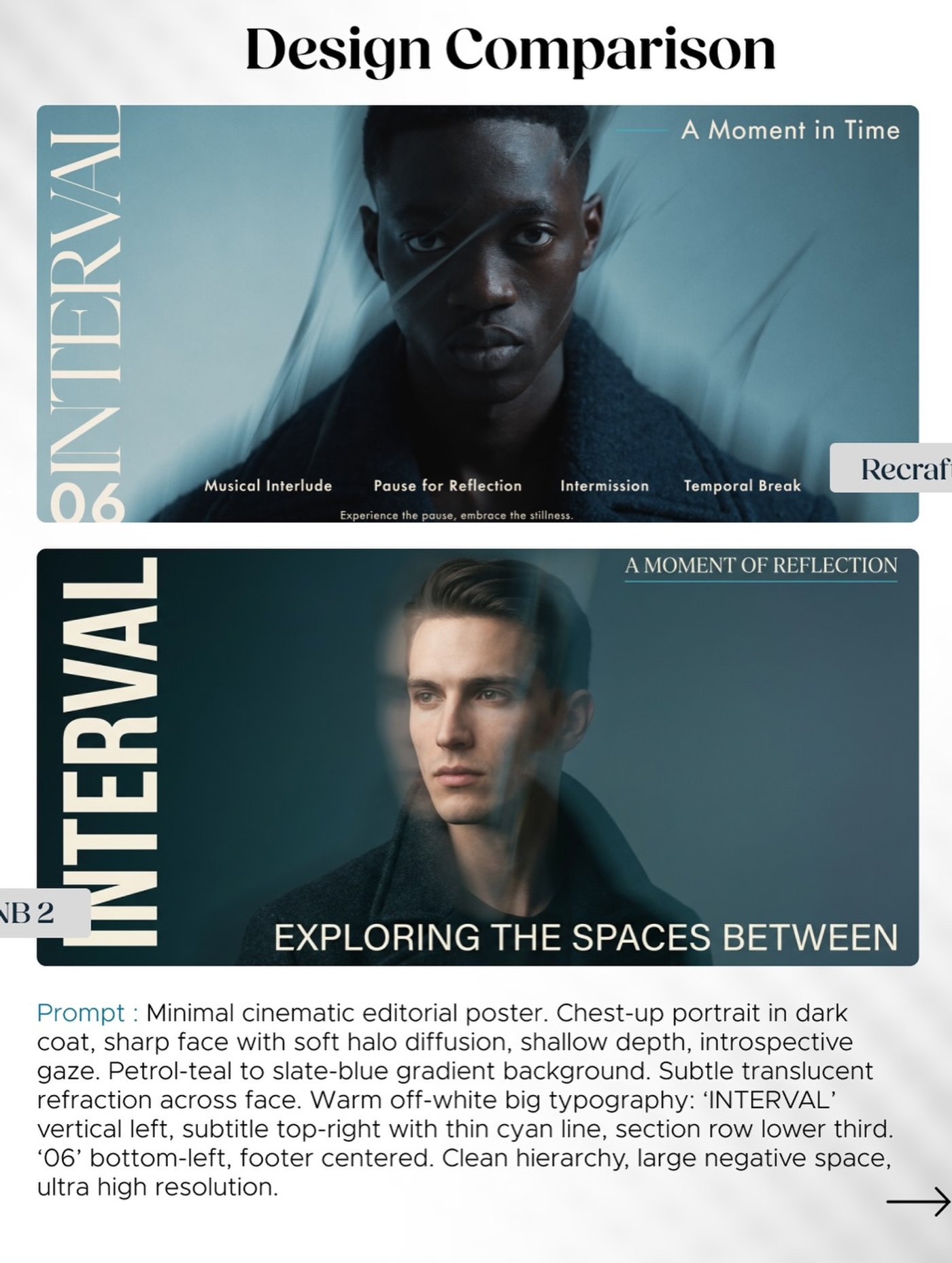 Recraft approaches this differently. When you ask it for a poster, magazine cover, album sleeve, or interface‑style card, it tries to arrange it in ways that feel intentional. Headlines usually land in logical positions, supporting text flows around imagery instead of colliding with it, and there is often a clear reading order from title to details. White space and margins tend to behave more like a human‑designed layout than a random collage.