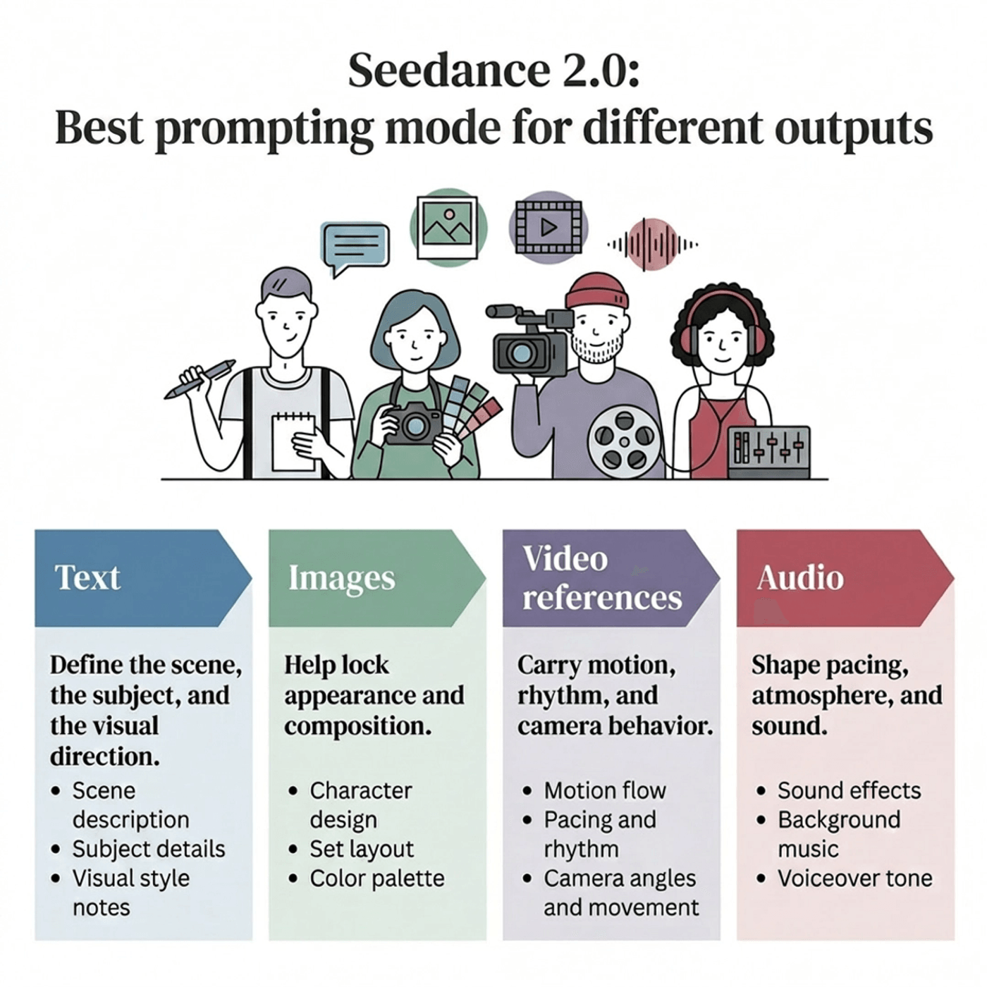 1. Seedance 2.0 works best by splitting control across text, images, video references, and audio.
