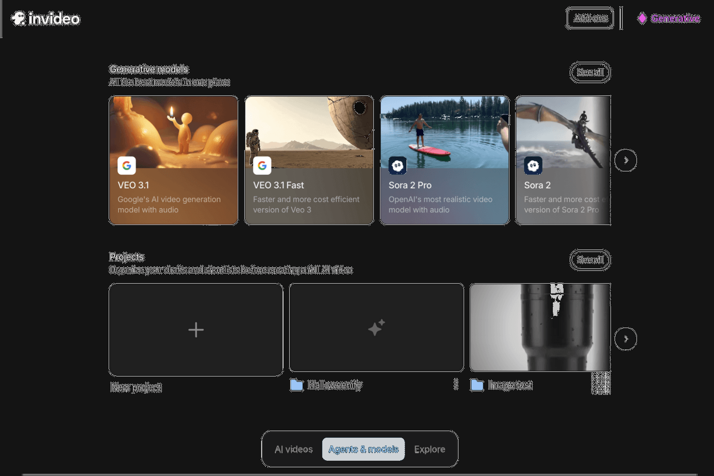 Let’s talk about the steps on how the images and videos are generated with invideo’s AI tools. Head over to invideo's generative models page under the Agents & models tab and choose the “Halloweenify” tool.