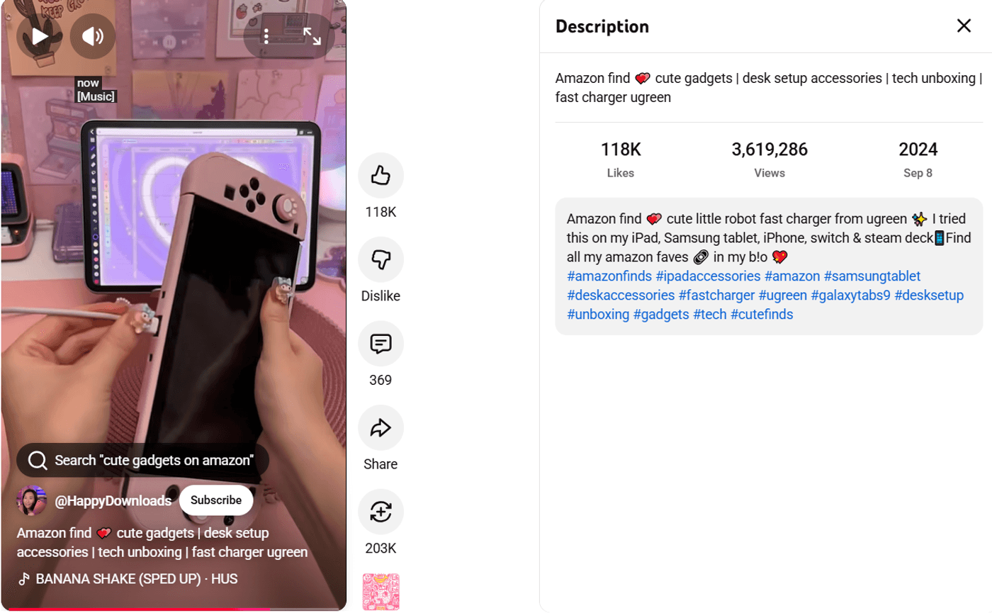 For home and electronics, YouTube Shorts are perfect for quick, visual storytelling. The sweet spot is 15-45 seconds, which is long enough to demonstrate value, but short enough to keep viewers watching. Take this Short by @HappyDownloads as an example, which immediately captures attention with a close-up of the charger.