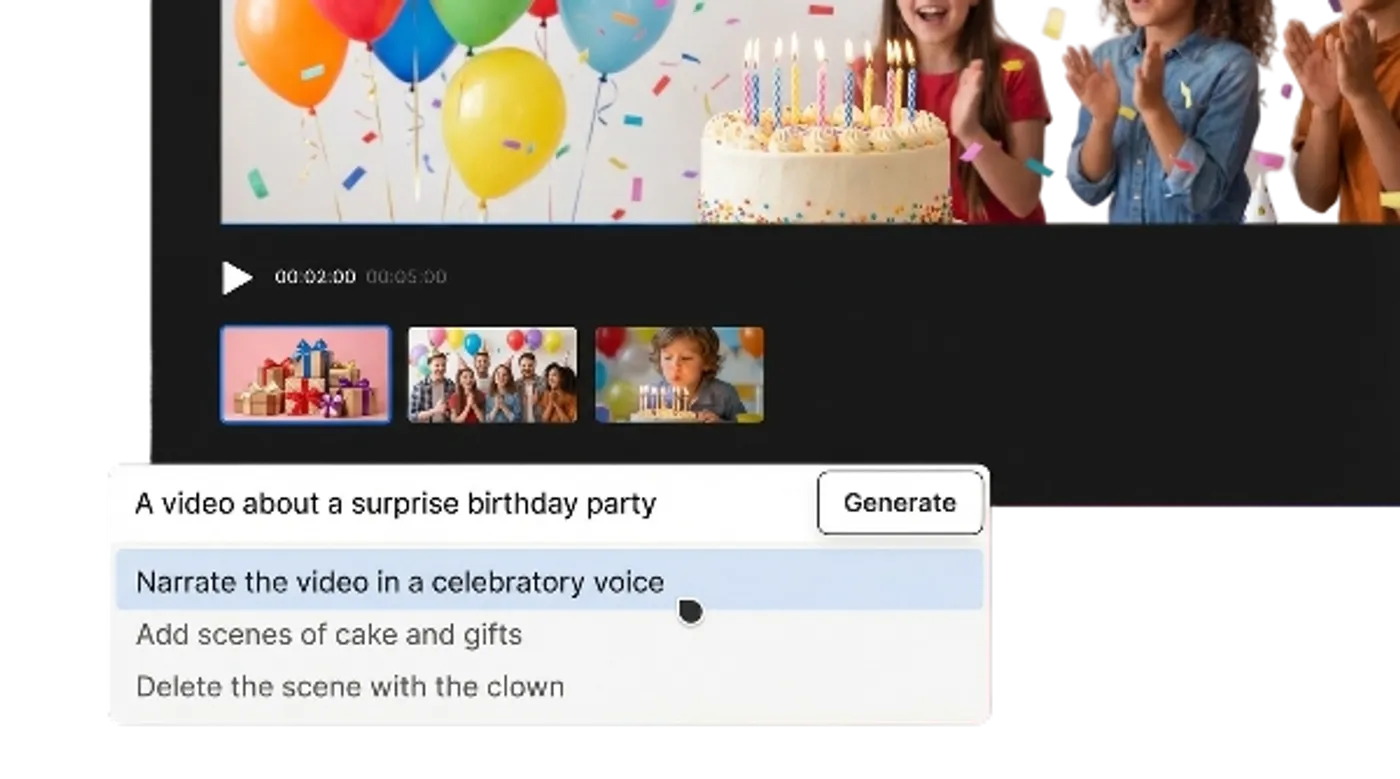 Create unforgettable happy birthday video messages in minutes with simple text prompts. Invideo generates the script, designs the scenes, adds generative media, voiceovers, subtitles, music, and effects, delivering a complete birthday video.