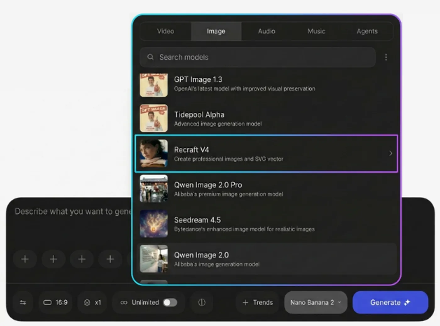 Select Recraft V4 and type a text prompt describing the image you want. Be as specific as you like — include style, colors, mood, composition, and whether you need raster or vector output.
