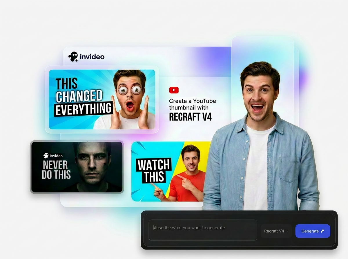 Generate images with Recraft and use them directly in your invideo projects. Create thumbnails, scene visuals, overlays, and social graphics, then assemble them into polished videos without switching tools.