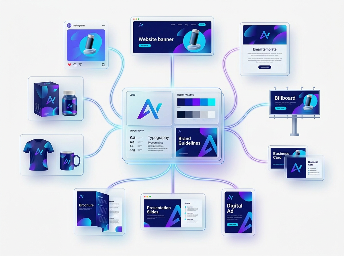 Full sets of on-brand social posts, banner ads, and email graphics generated from a single style reference.