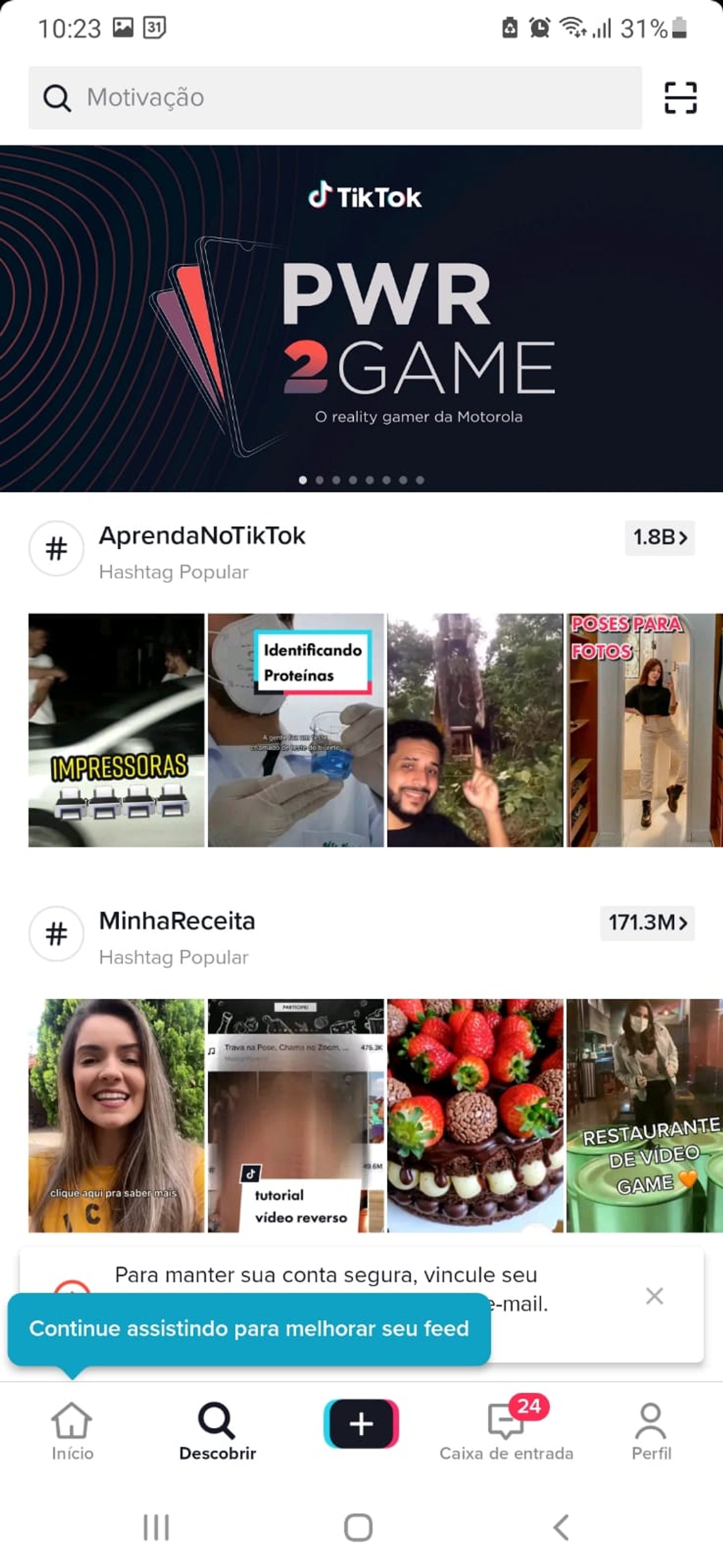 Ao clicar no botão Descobrir, você é levado para uma página onde é possível conferir os vídeos em destaque, as hashtags mais populares. A partir dessa tela, é possível visitar perfis de usuários, vídeos, músicas ou hashtags.